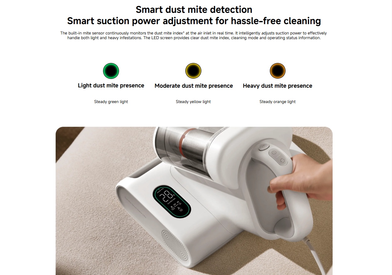 Three levels of suction that automatically adapt based on dust mite presence.