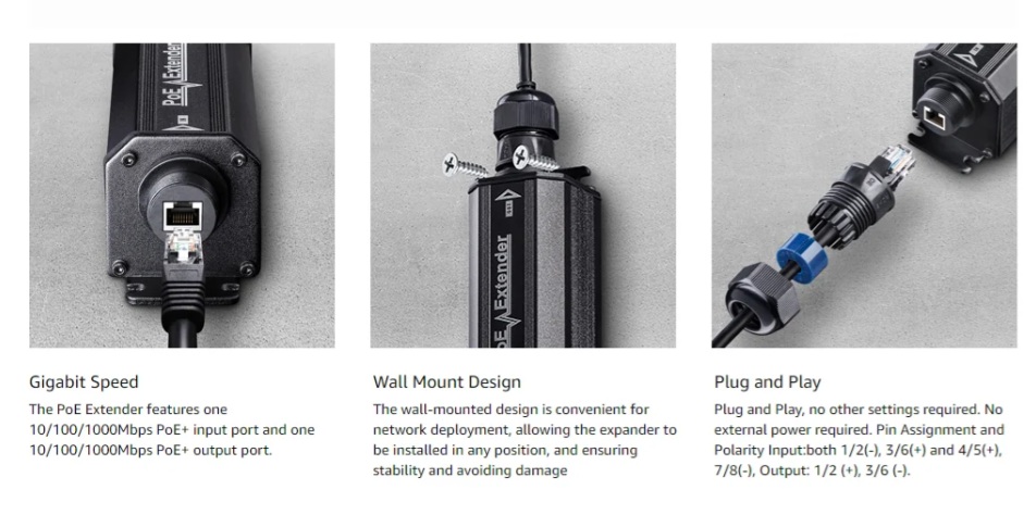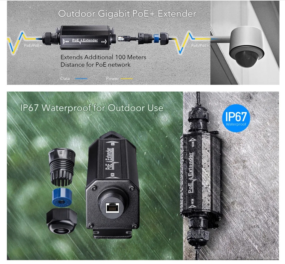 A weather-proof PoE extender that extends the PoE distance by 100m.