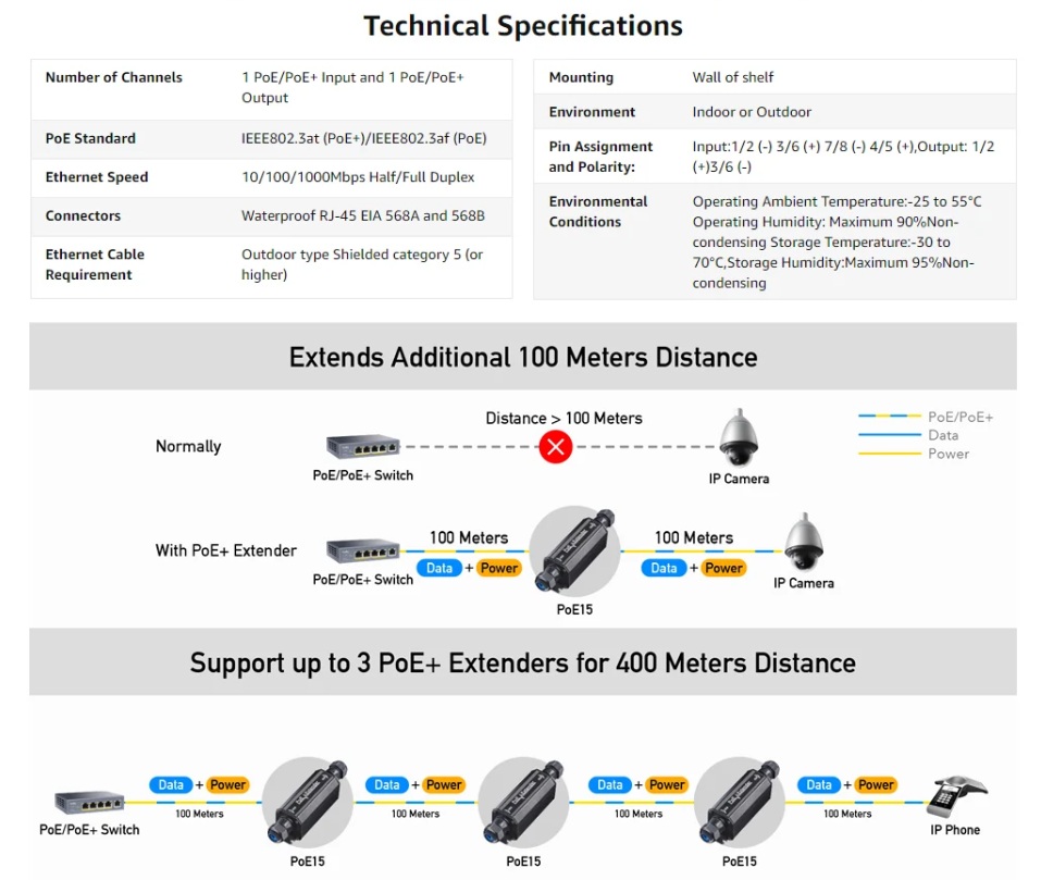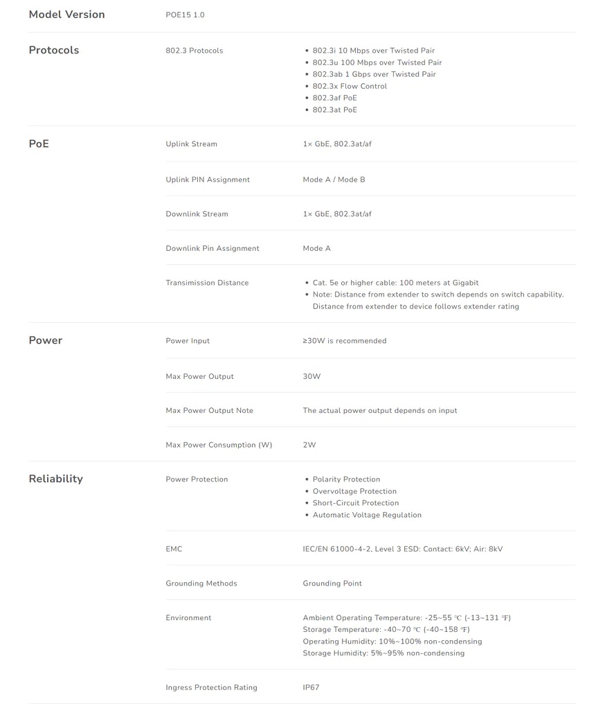 Features: • Model Version: POE15 1.0 Protocols • 802.3 Protocols: -802.3i 10 Mbps over Twisted Pair -802.3u 100 Mbps over Twisted Pair -802.3ab 1 Gbps over Twisted Pair -802.3x Flow Control -802.3af PoE -802.3at PoE PoE: • Uplink Stream: 1× GbE, 802.3at/af • Uplink PIN Assignment: Mode A / Mode B • Downlink Stream: 1× GbE, 802.3at/af • Downlink Pin Assignment: Mode A • Transimission Distance: -Cat. 5e or higher cable: 100 meters at Gigabit -Note: Distance from extender to switch depends on switch capability. Distance from extender to device follows extender rating Power • Power Input: ≥30W is recommended • Max Power Output: 30W • Max Power Output Note: The actual power output depends on input • Max Power Consumption (W): 2W Reliability • Power Protection: -Polarity Protection -Overvoltage Protection -Short-Circuit Protection • EMC: IEC/EN 61000-4-2, Level 3 ESD: Contact: 6kV; Air: 8kV • Grounding Methods: Grounding Point Environment -Ambient Operating Temperature: -25~55 ℃ (-13~131 ℉) -Storage Temperature: -40~70 ℃ (-40~158 ℉) -Operating Humidity: 10%~100% non-condensing -Storage Humidity: 5%~95% non-condensing • Ingress Protection Rating: IP67 • Certifications: FCC, CE Mechanical: • Install in a Daisy Chain: Up to 3 extenders in a chain • Installation: Desktop, Wall-mount • Dimension: 185×45×45 mm • Casing Material: Metal • Product Weight: 250 g (8.82 oz.) |