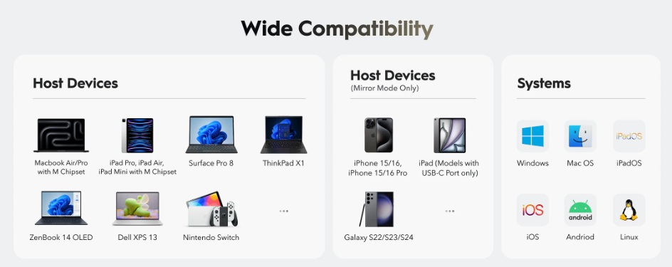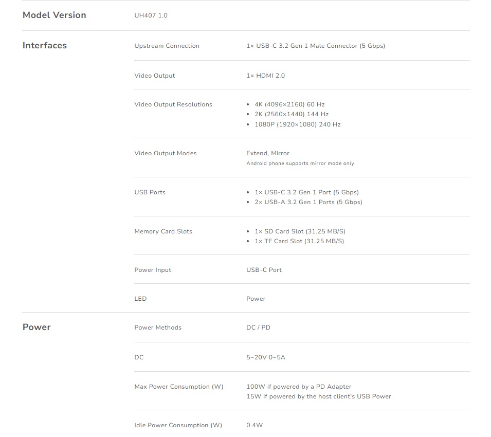 Features: • Model Version: UH407 1.0 Interfaces • Upstream Connection: 1× USB-C 3.2 Gen 1 Male Connector (5 Gbps) • Video Output: 1× HDMI 2.0 • Video Output Modes: Extend, Mirror (Android phone supports mirror mode only) • USB Ports: 1× USB-C 3.2 Gen 1 Port (5 Gbps), 2× USB-A 3.2 Gen 1 Ports (5 Gbps) • Memory Card Slots: 1× SD Card Slot (31.25 MB/S), 1× TF Card Slot (31.25 MB/S) • Power Input: USB-C Port • LED: Power • Video Output Resolutions: -4K (4096×2160) 60 Hz -2K (2560×1440) 144 Hz -1080P (1920×1080) 240 Hz Power • Power Methods: DC / PD • DC: 5~20V 0~5A • Max Power Consumption (W): 100W if powered by a PD Adapter, 15W if powered by the host client's USB Power • Idle Power Consumption (W): 0.4W Physical • Color: Silver Gray Color • Casing: Aluminum, ABS Requirements • Hardware Requirement: Requires a USB-C 3.2 Gen 1 / USB4 / Thunderbolt 3/4 port on the host device • Driver Installation • Compatible OS: -Windows 7 or later -macOS 10.12 or later -Ubuntu LTS 18.04 or later -Android 5 or higher -iPadOS -iOS -Nintendo Switch system software (When the PD-IN port is receiving power) Reliability • Environment -Operating Temperature: 0~40 °C (-32~104 °F) -Storage Temperature: -20~70 °C (-10~158 °F) -Operating Humidity: 20~85% RH non-condensing -Storage Humidity: 10~90% RH non-condensing Mechanical • Product Weight: 62.6 g (2.21 oz.) • Dimension -Main Part : 130×32×11 mm -Cable: 250 mm |
