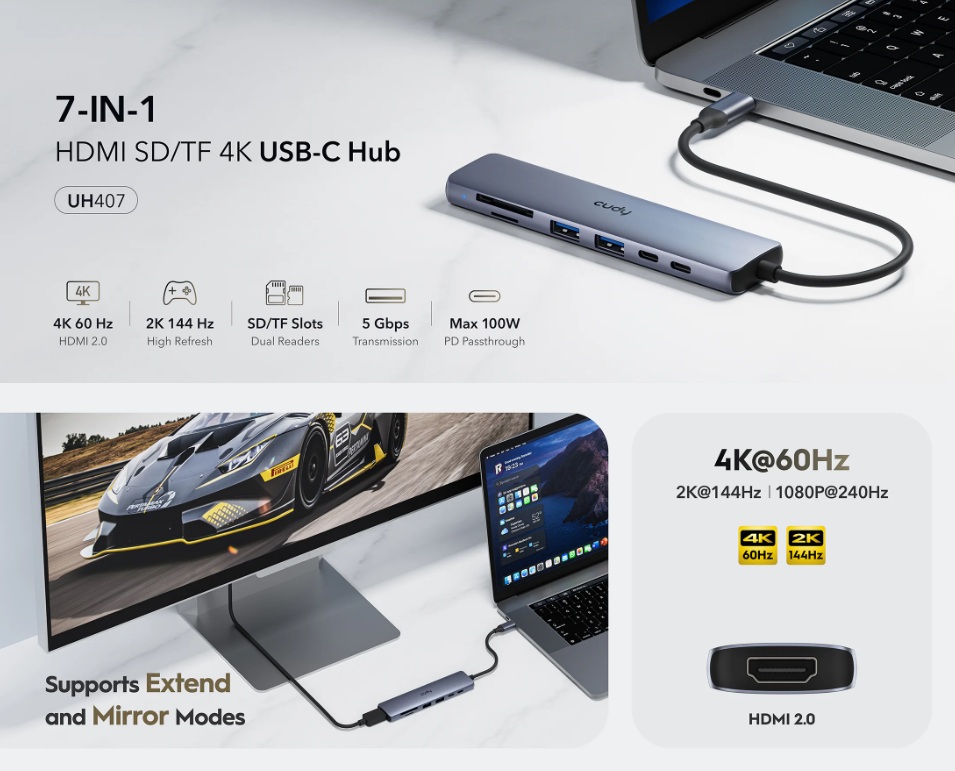 【 Cudy UH407 - 7-In-1 HDMI SD/TF 4K USB-C Hub (UH407 1.0) 】