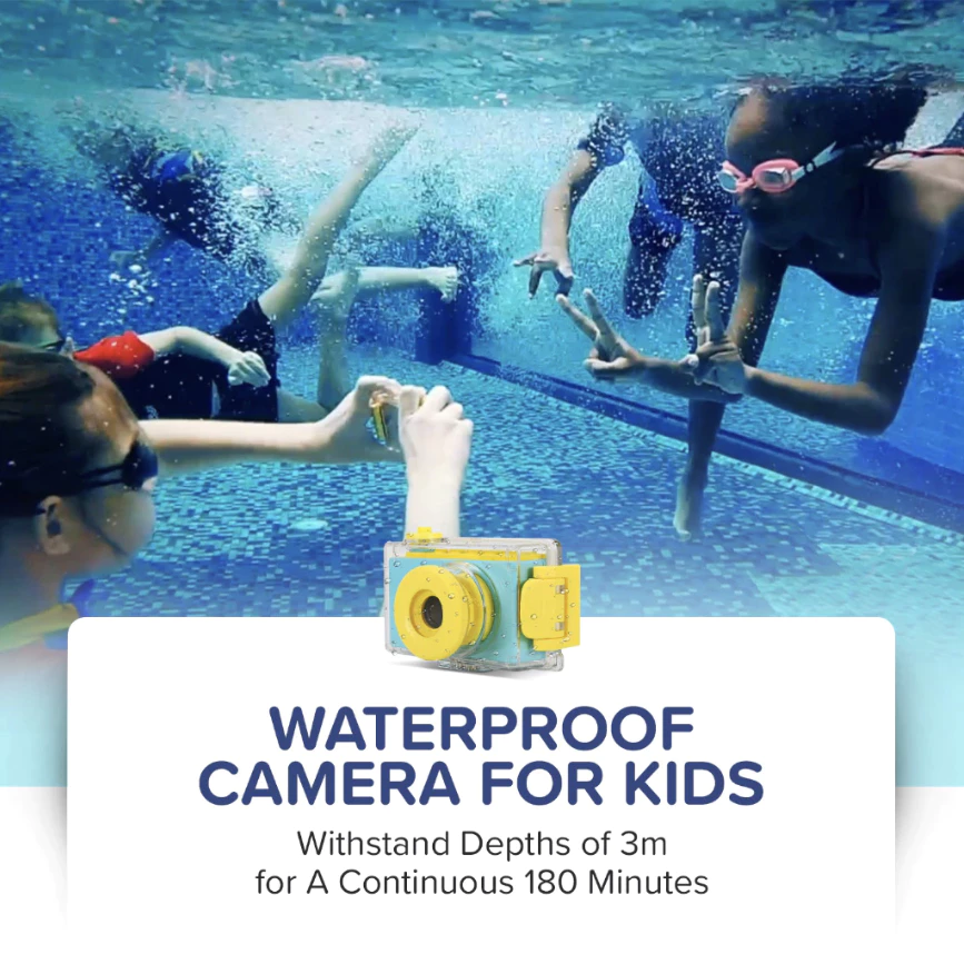 The myFirst Camera 2 itself is not waterproof. However, it comes with a special waterproof casing. Make sure to place the camera inside the case before using it in water. The case is made with reinforced high-strength polymers, providing extra drop protection and allowing underwater use up to 3 meters deep for as long as 180 minutes!