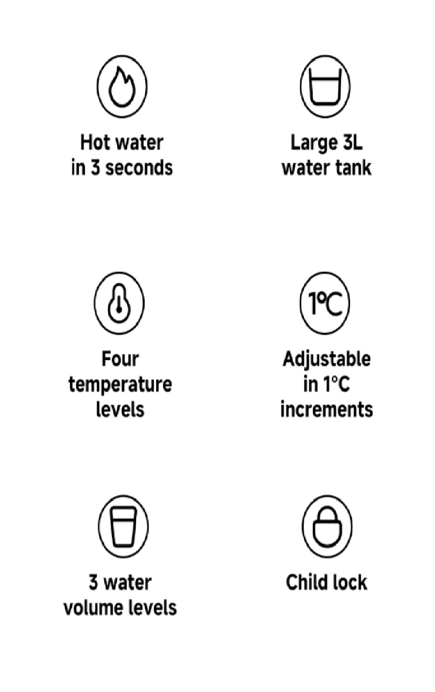 Includes room temperature, 45 °C for baby formula, 75 °C for tea and 95 °C for hot water to cover everyday drinking needs.