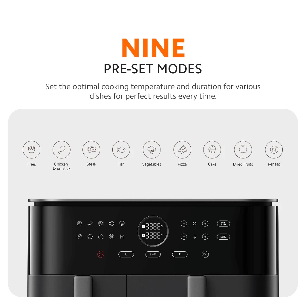 Supports frying, roasting, baking, grilling, reheating, and more for versatile, hassle-free cooking.