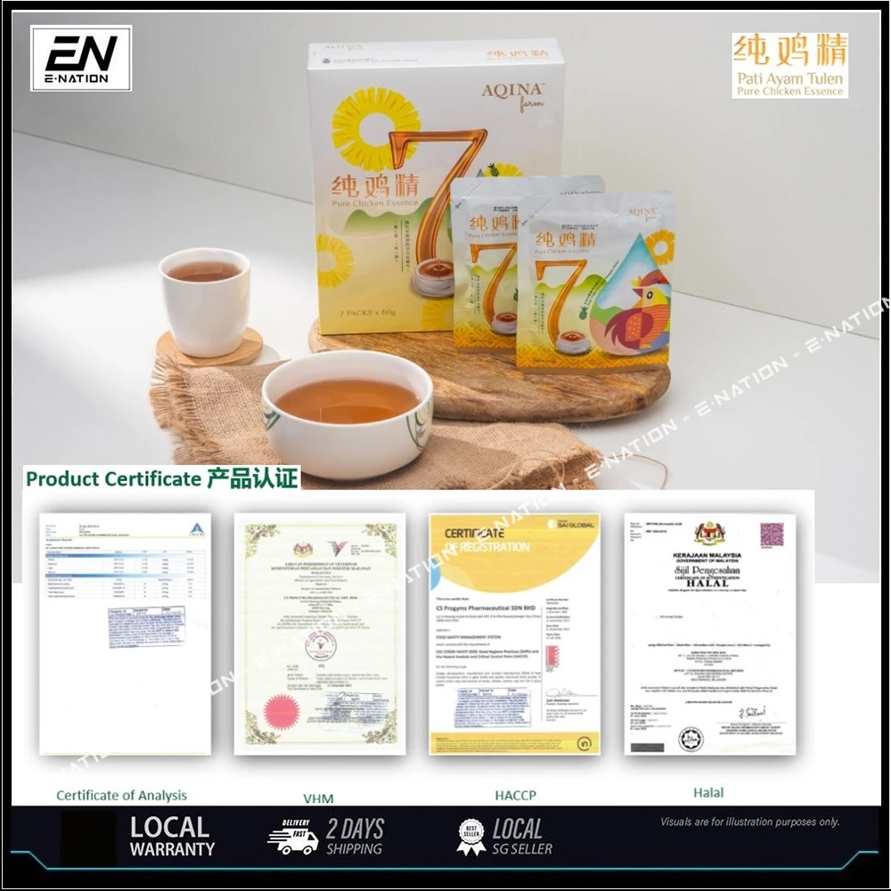 Aqina 7 days single-origin pure chicken essence is made from whole pineapple chicken by using a unique double-boiled process to give strong fragrance and mellow chicken taste. This product is high in protein, protein helps build and repair body tissues, it is also essential for growth and development, Pineapple chicken raised on Aqina's Farm that have been enriched with MD2 pineapple chicken, making it free of antibiotic residue, growth hormone, and are lower in fat.