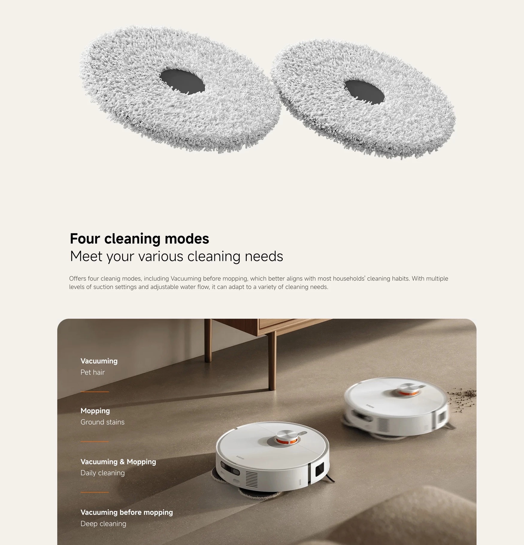 Carpet Boost & Auto Mop Pad Lifting-- Automatically raises mop pads when carpet is detected and increases suction for deep carpet cleaning without wetting the carpet.