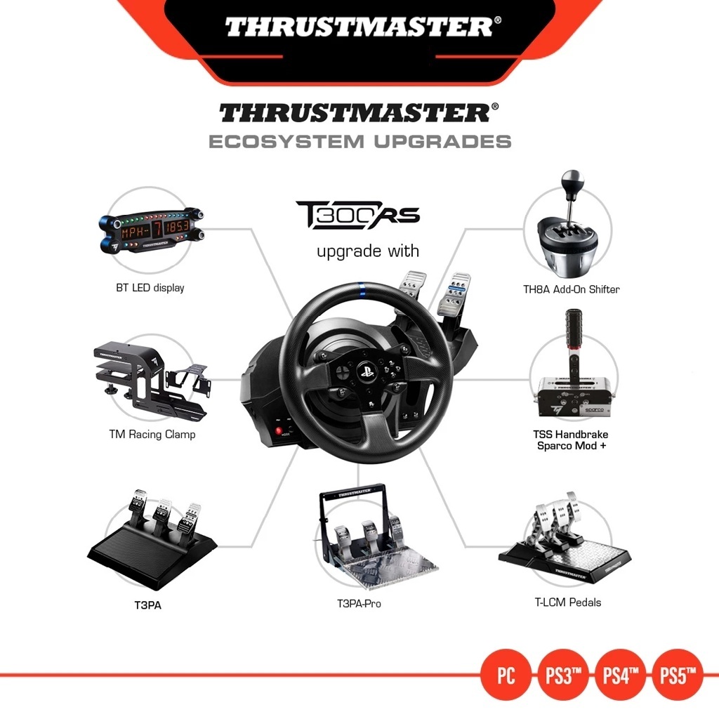 -- Compatible on PS4, PS3 & PC with Thrustmaster 3-pedal pedal set T3PA-PRO.Compatible on PS4, PS3 & PC with the TH8A shifter (TH8A – Thrustmaster TH8 Add-on).