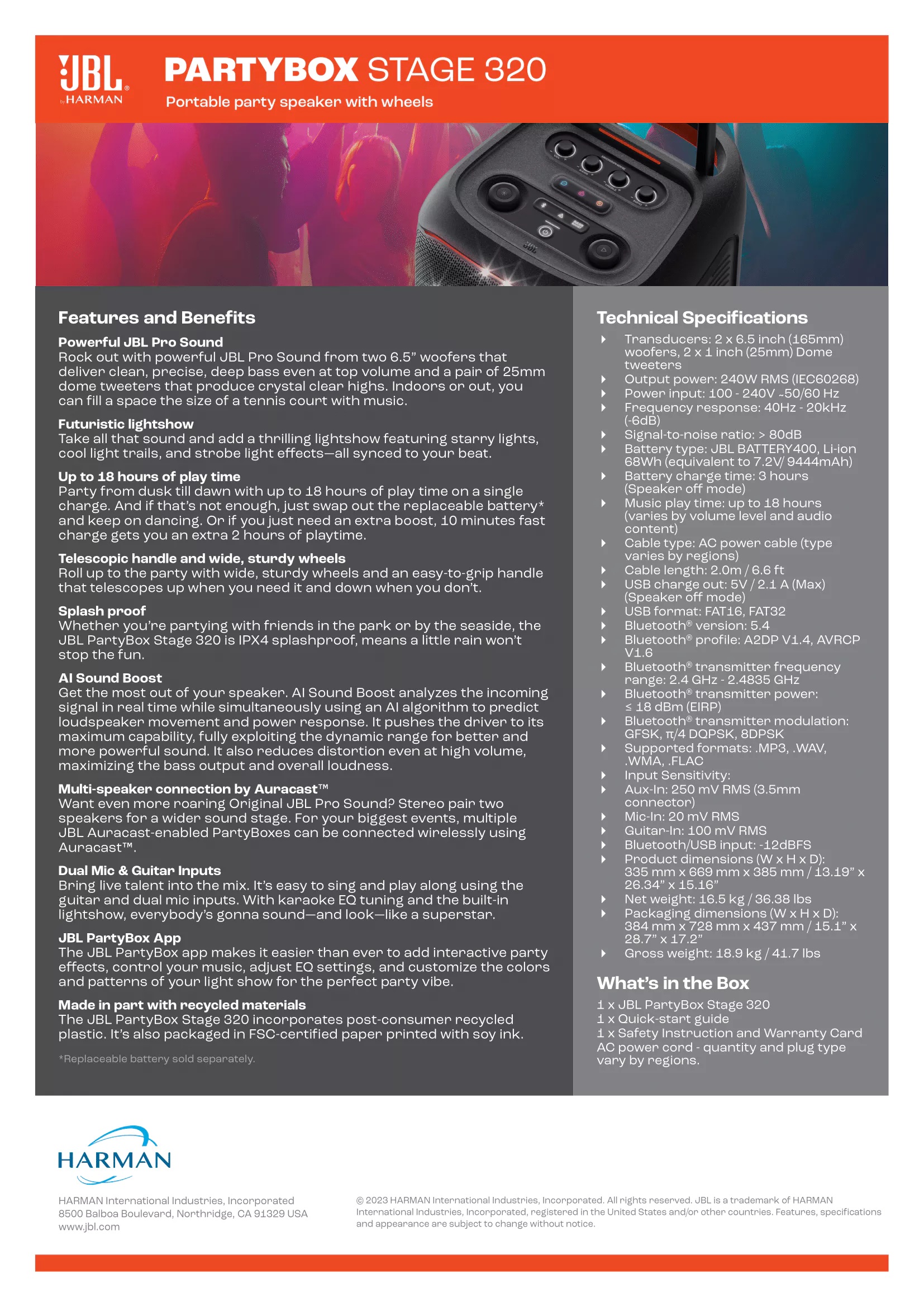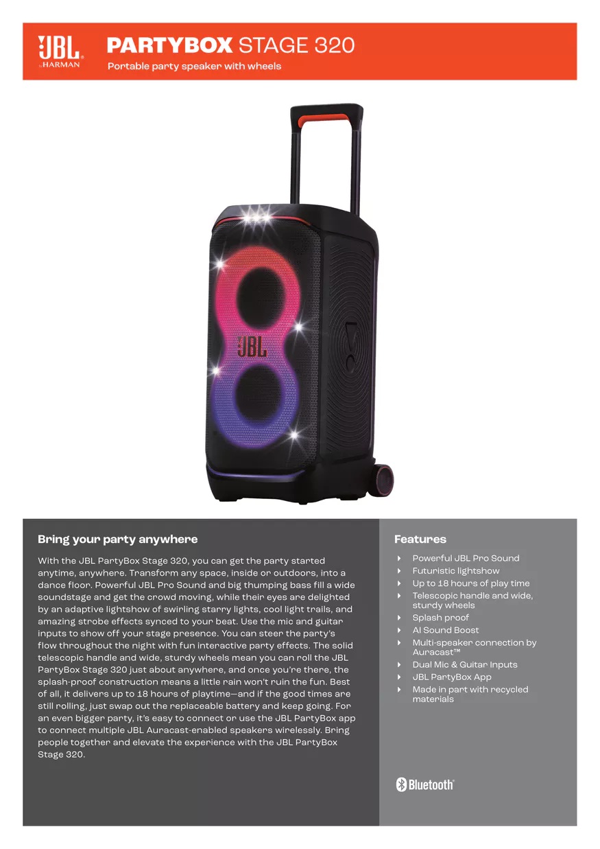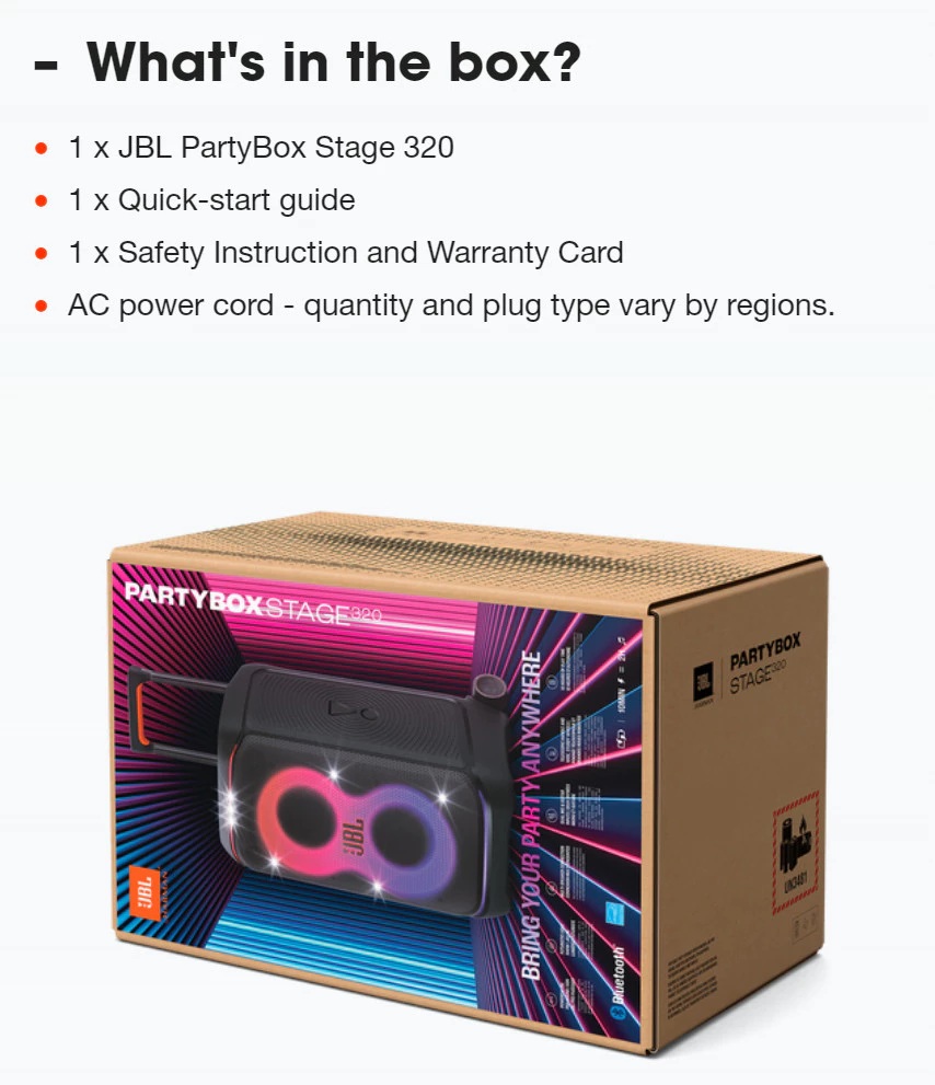 Splash proof-- Whether you’re partying with friends in the park or by the seaside, the JBL PartyBox Stage 320 is IPX4 splashproof, means a little rain won’t stop the fun.