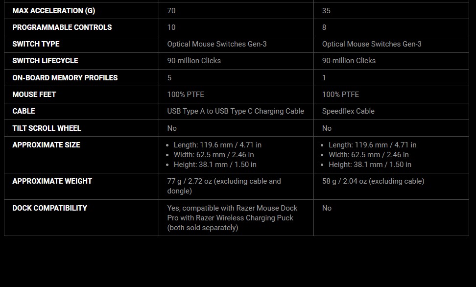 - Up to 22 hours with the Razer HyperPolling Wireless Dongle and Mouse Dock Pro* (constant motion at 8000 Hz)