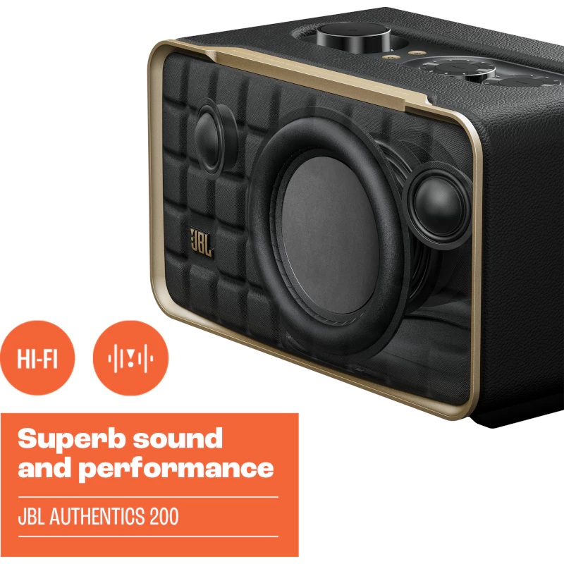 Make a statement with powerful sound and distinctive retro style. The JBL Authentics 200 speaker recalls JBL’s iconic ‘70s styles — featuring a Quadrex grille, custom leather-like enclosure, and premium aluminium frame, now with even better performance and versatility.